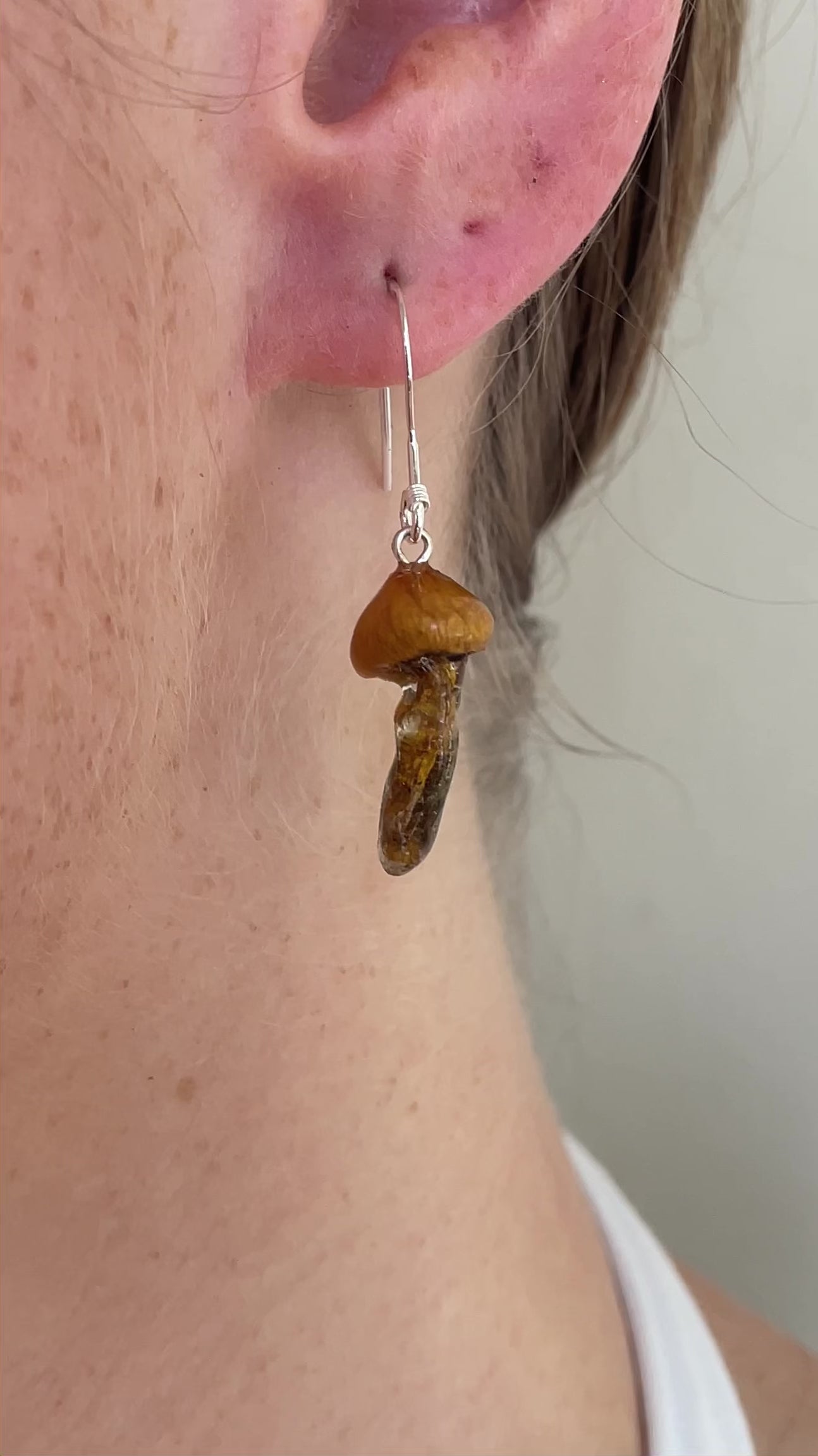 Mushroom Earrings complemented on Sterling Silver earring hooks. This pair captures the essence of the forest, showcasing locally foraged genuine mushrooms.