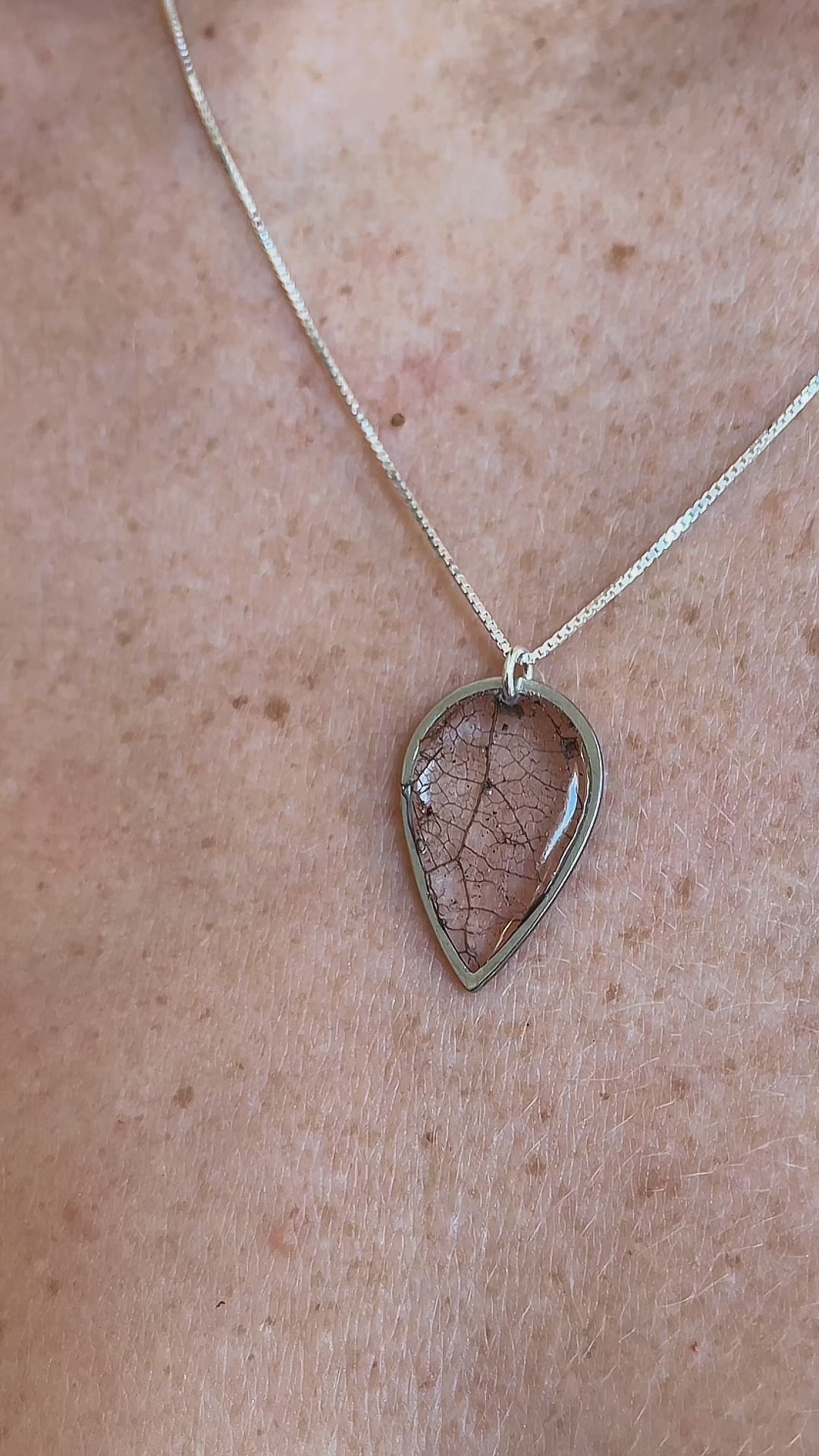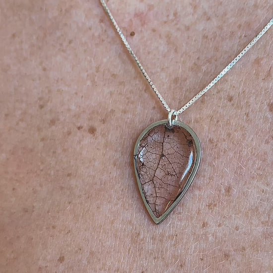 Skeleton leaf necklace complemented with a Sterling Silver chain. This piece captures the essence of the forest, showcasing locally foraged skeleton leaves sealed with resin into a frame.